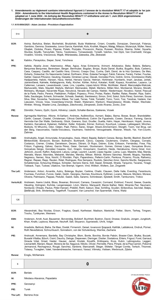 ➡️ 6 maja 2025 roku większość europosłów Prawo i Sprawiedliwość, Platforma Obywatelska i ich politycznych „przystawek” zagłosowała ZA wzmocnieniem roli Światowej Organizacji Zdrowia [World Health Organization (WHO)] poprzez poparcie niebezpiecznych zmian w Międzynarodowych Przepisach Zdrowotnych (IHR).